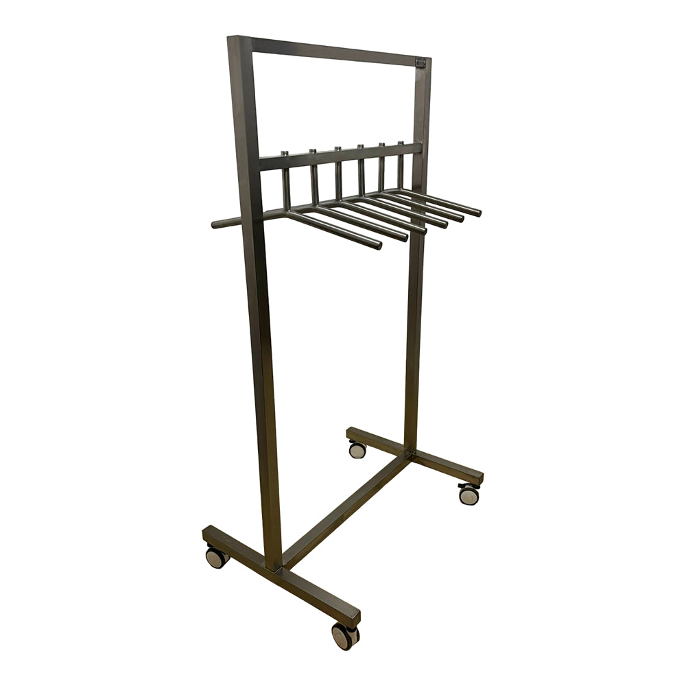 Estrutura em aço inox 304 com acabamento escovado, resistente à umidade e ao uso contínuo. Possui barra superior para múltiplos cabides, aventais ou coletes de chumbo. Equipado com quatro rodízios giratórios, sendo dois com trava, que facilitam o transporte e garantem estabilidade durante o uso. Produto projetado para fácil limpeza e longa durabilidade.