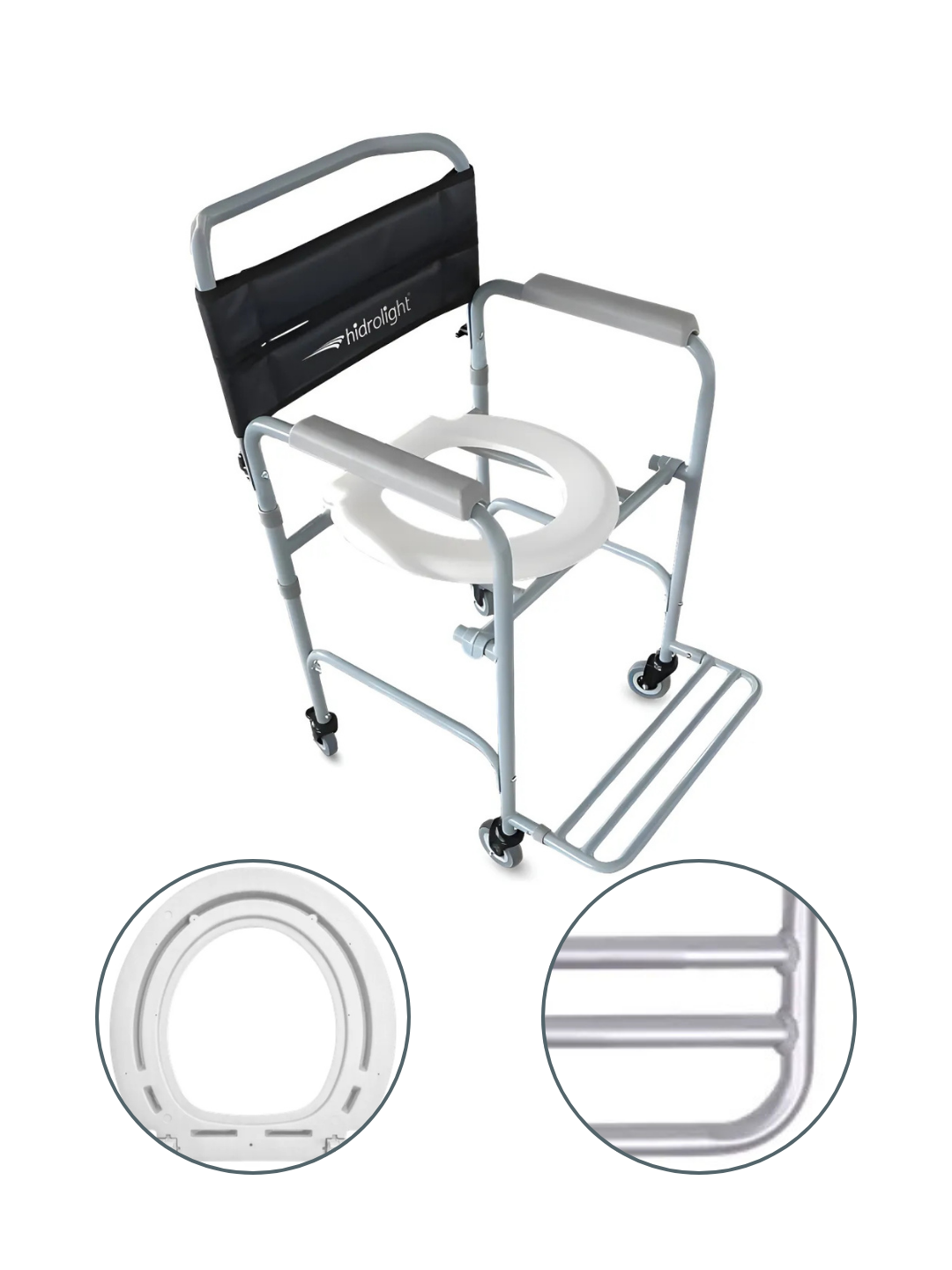 Assento e encosto: polietileno anatômico com abertura frontal