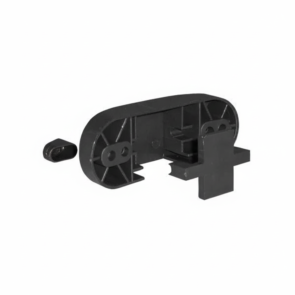 Canoa de fixação para encosto na cor preta, 02 parafusos, 02 acabamentos plásticos e 01 apoio de encaixe para o pino do suporte “L” (pino não incluso).